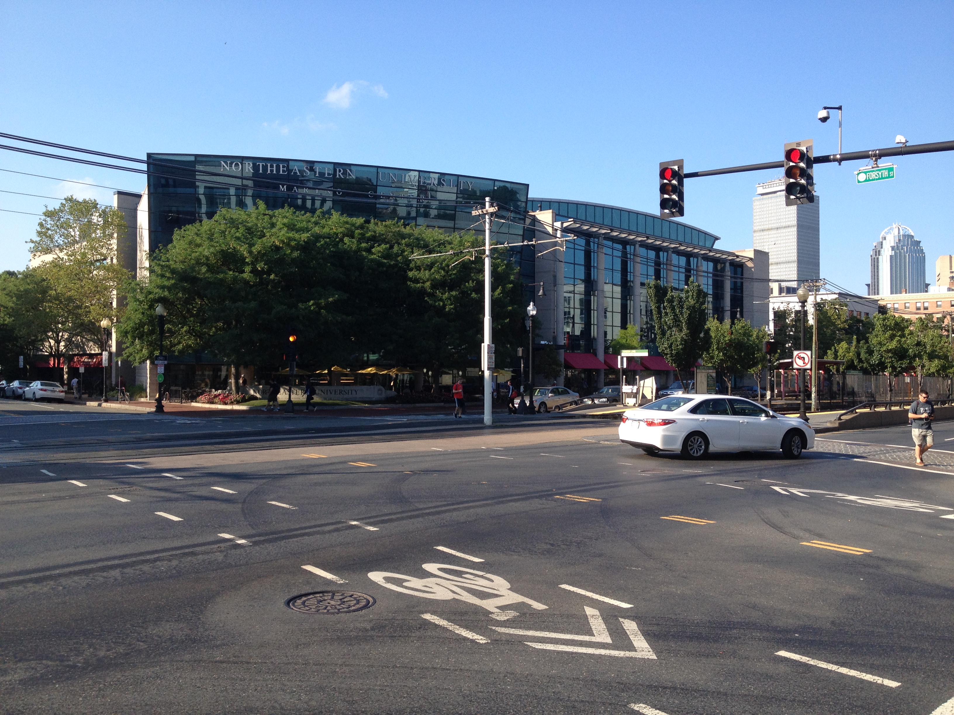 Northeastern plaza in Boston (with Prudential Tower peaking behind the light), July 2016.